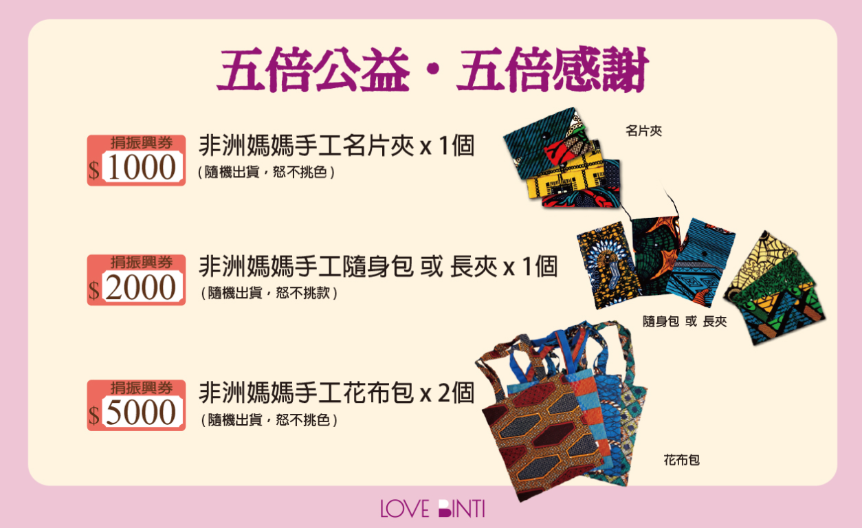 1. 捐振興1,000 元,非洲媽媽手工名片夾乙個 (隨機出貨,怒不挑色)。