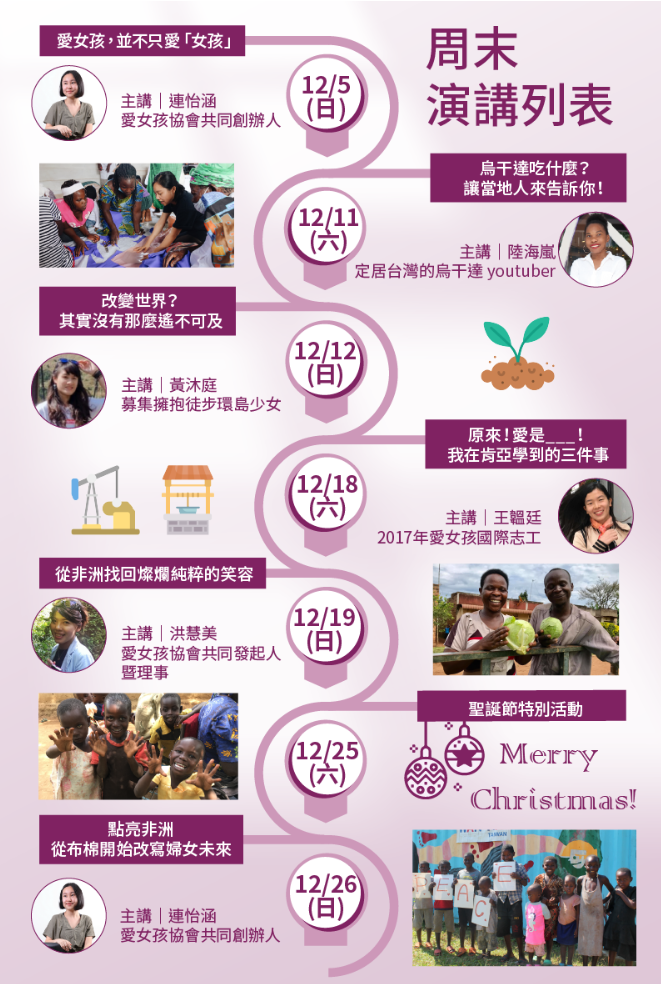 每逢週末下午14:00-15:00,也都有精彩的講座分享,由曾拜訪過非洲的台灣人,以及在台灣生活的烏干達人,來講講他們在非洲的故事與看見!