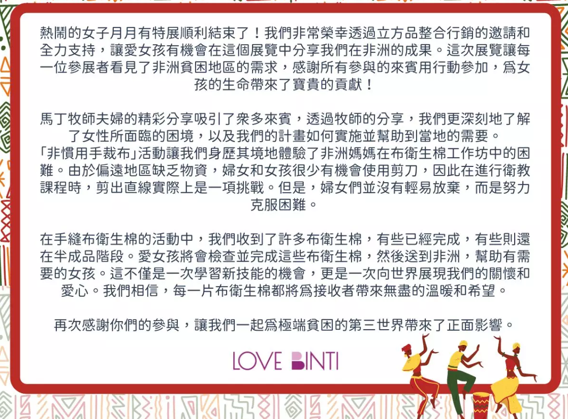非洲偏鄉女性經常因為負擔能力問題,而無法獲得基本生理 用品,有些女孩甚至透過性交易換取衛生棉。 供應可重複使用的布衛生棉,降低了每月購買拋棄式衛生棉 的經濟負擔,換算起來每年大約是120,000烏先令(986台幣), 這筆錢現在可以被應用在比如教育、食物、或健康等地方。 少了經濟依賴,女性可以重掌她們的身體和維生選擇,可謂「布衛生棉讓她們自由。」🎈🎈