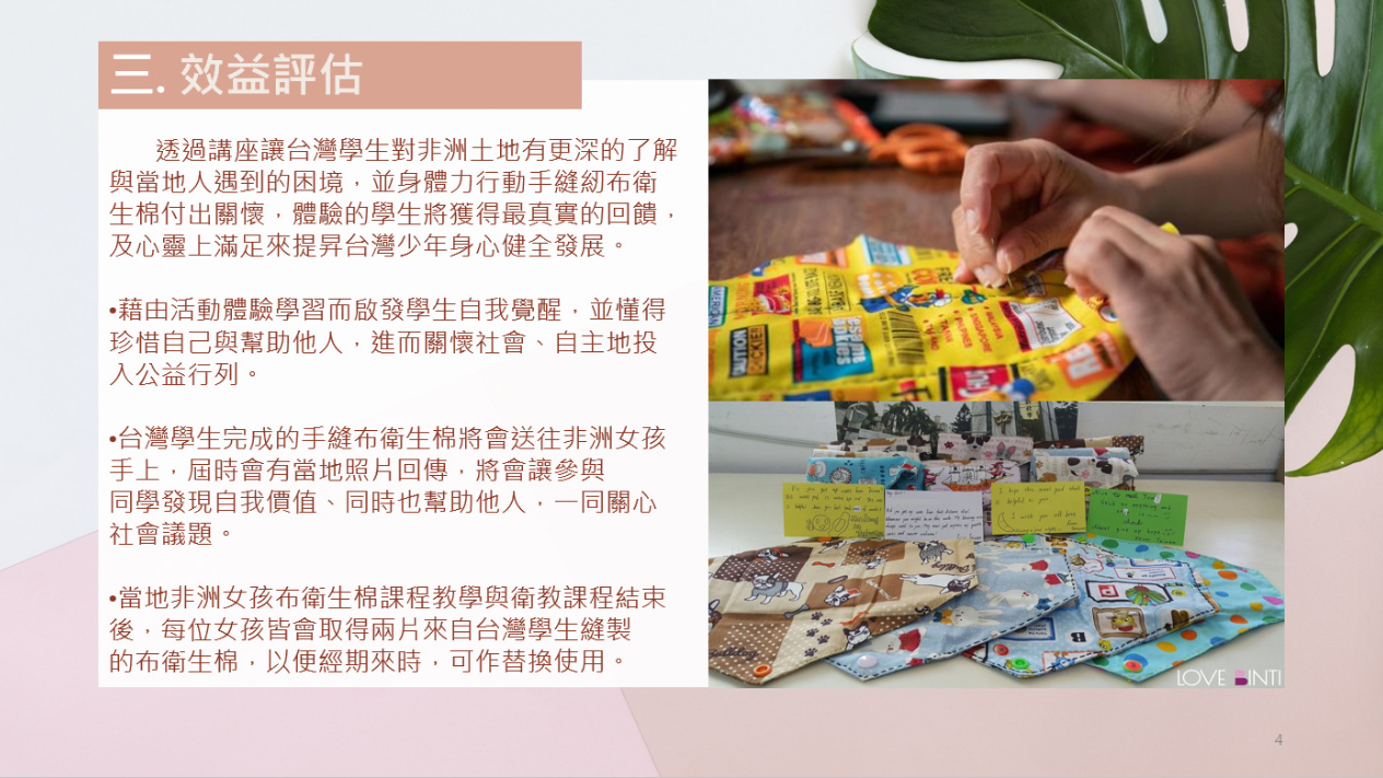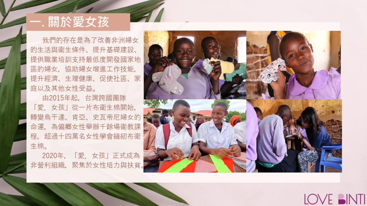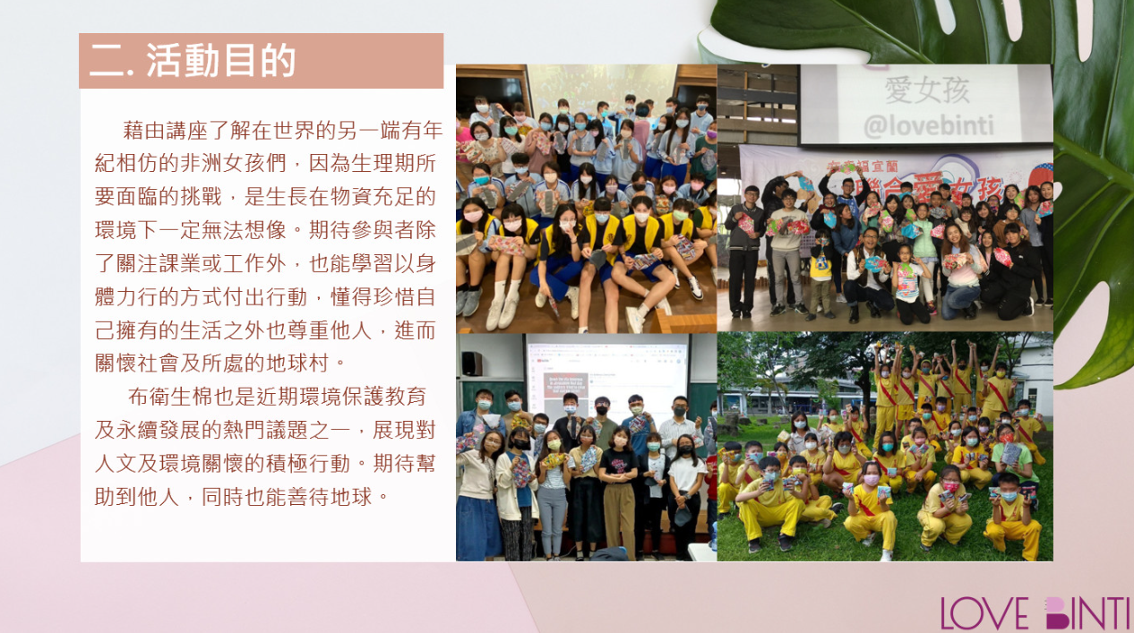 📌【愛女孩 X 校園合作】 演講邀約 專欄文章 01 1 月 2027 每一塊布,都是一個女孩守護自己的開始。每一場演講,都是一個世界觀被悄悄打開的瞬間。 我們相信,月經不該是羞於啟齒的話題;非洲,也不只是新聞裡的遙遠地名。 ✉️ 若想預約講座,或想進一步了解合作細節,歡迎來信 cc@lovebinti.org或來電 0921-531-255,我們很期待和學生們一起在校園裡,來一場不一樣的對話。 志工募集 校園募集 講座論壇 工作坊 布衛生棉 其他消息 2030.08.27 📌攜手萬海,十年同行,為非洲建構乾淨安全的未來了解更多 2030.08.10 📌【企業合作】手作體驗 x 議題分享(持續更新)了解更多 2025.08.29 布衛生棉募集開跑|縫一片,改變一生了解更多 更多消息