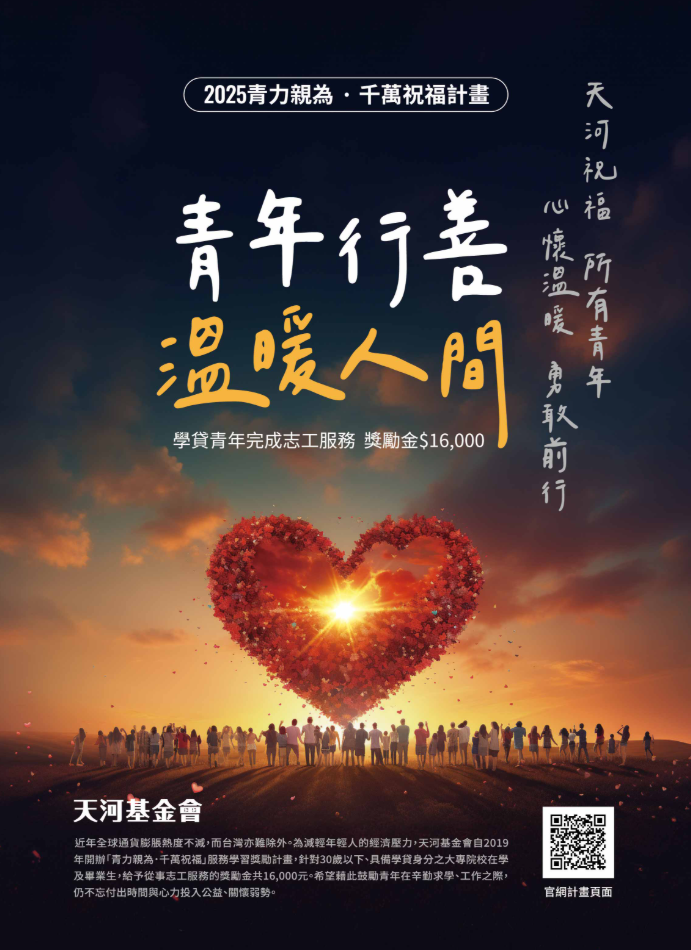 只要你投入公益行動,參與志工服務,天河教育基金會將提供每人 16,000 元的獎勵金,減輕你的學貸壓力,也陪你在助人的過程中,找到成就感與人生方向!