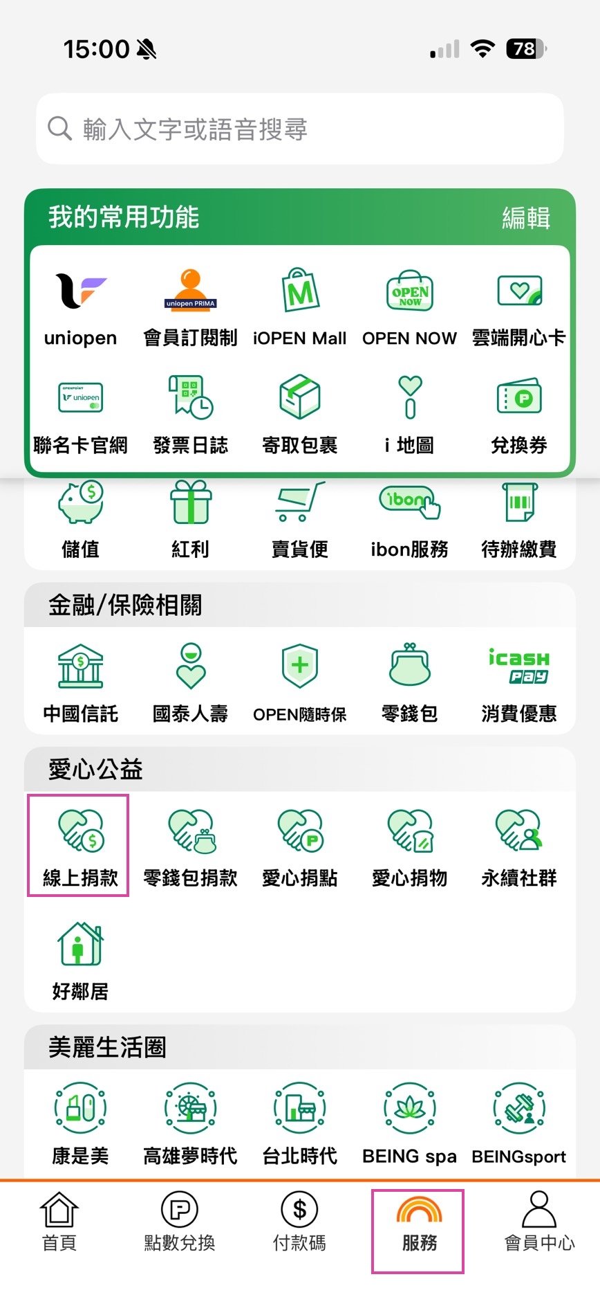 2.點選右下角「服務」專區後,選擇愛心公益區的「線上捐款」