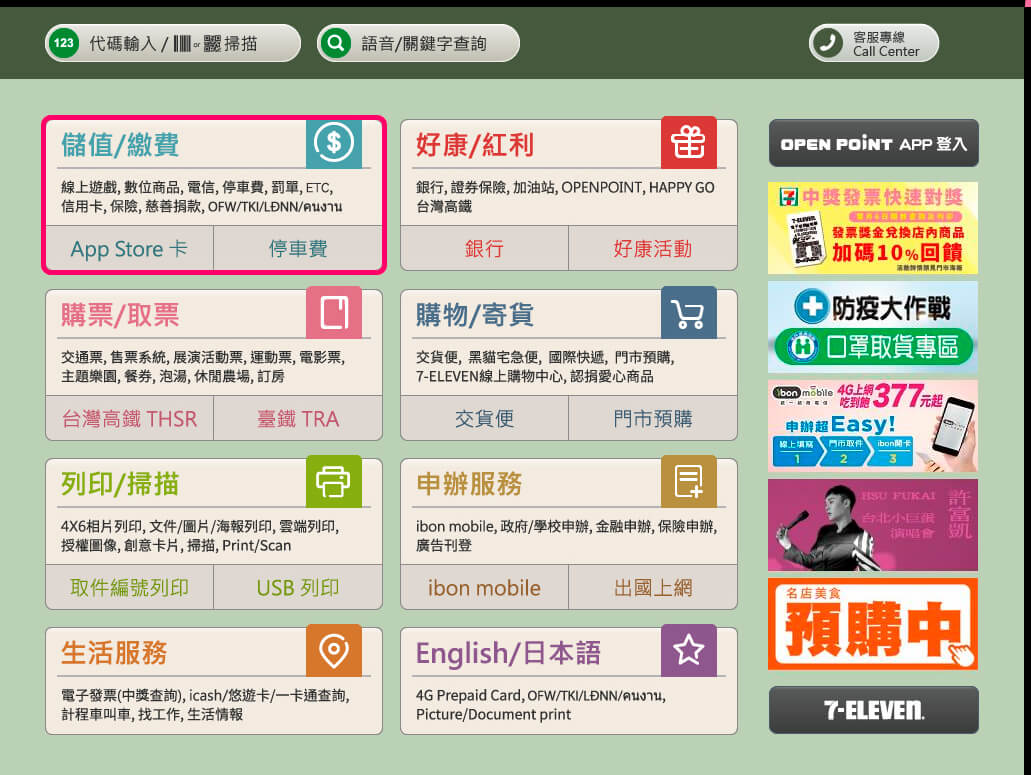 1.走進任一間 7-ELEVEN,找到 ibon 機台,進入「儲值/繳費」專區