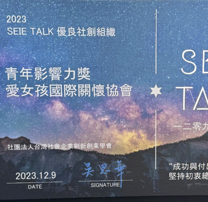 愛女孩國際關懷協會榮獲2023【SEIE TALK優良社創組織推薦】青年影響力獎 輔仁大學社會企業碩士學位學程主任-李禮孟,引言介紹及獲獎分享